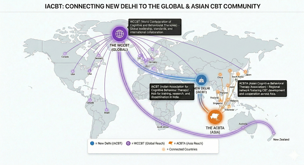 The IACBT is a permanent member of the Asian Cognitive Behavioural Therapies Association (ACBTA) and thereby of the World Confederation for Cognitive Behaviour Therapies (WCCBT). The WCCBT is our global body with a presence in every continent on the globe and has recently been inducted as a vendor by the World Health Organization. The ACBTA is a regional organization representing Asia in the WCCBT with membership of 12 Asian countries.